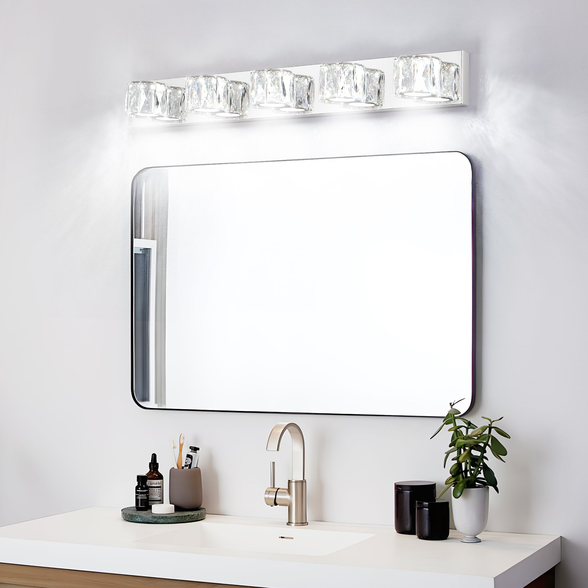 35" Modern Crystal 5-Light LED Wall Sconce – Elegant Chrome Bathroom Vanity Light with Clear CrystalMaterial: Stainless Steel & CrystalColor: ChromeLight Source Type: LEDLumen: 1625Color Temperature: 6000KInstallation Mode: Wall MountedSupported Control Mode: Switch Control, Non-adjustable BrightnessPower Supply Mode: Hard-WiredWattage: 25WVoltage: AC100-120VApplicable Space: Bathroom, Bedroom, or Hallway
