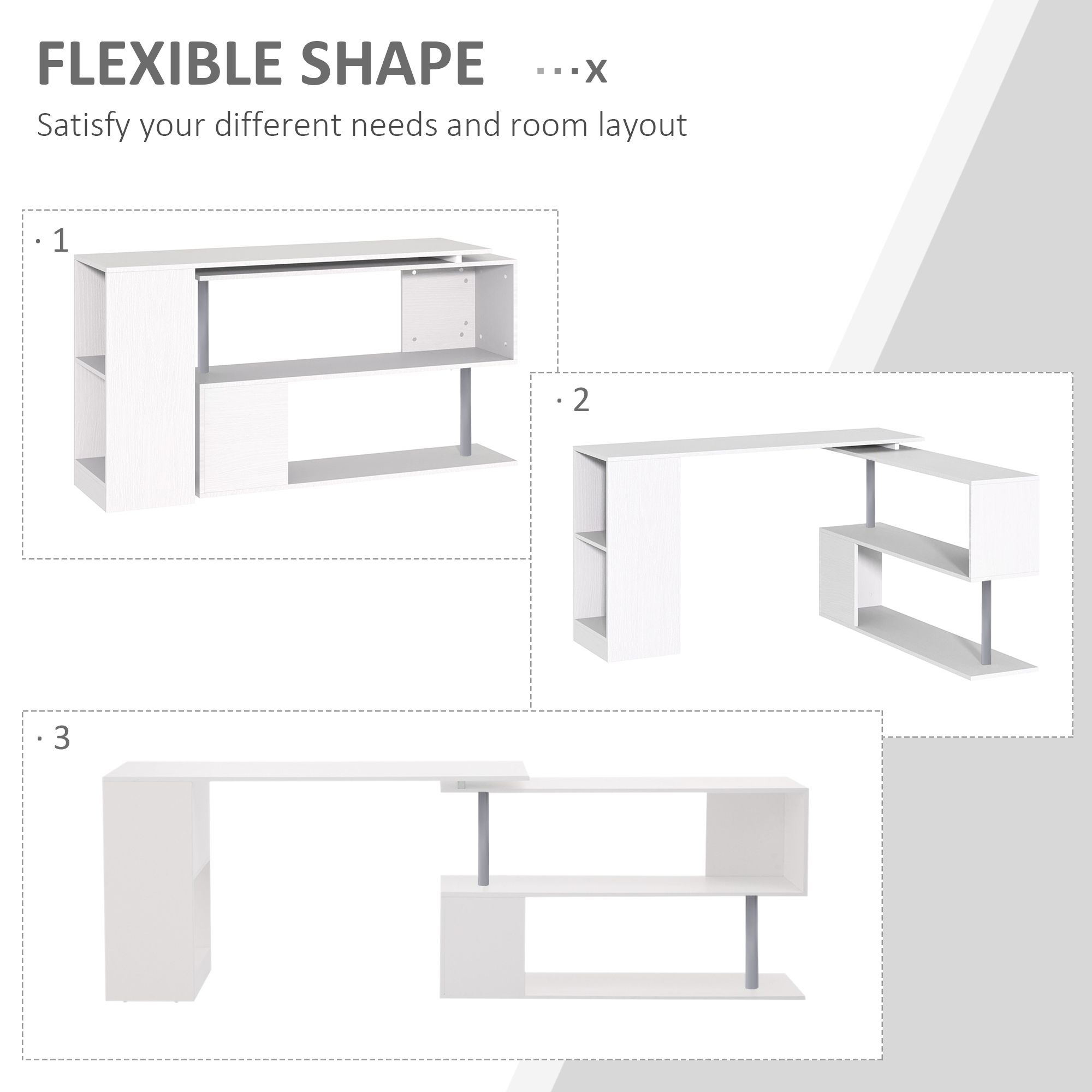 The HOMCOM L shaped desk features a unique rotating design that can be adjusted to your needs and contains plenty of storage space. The modern look adds a touch of class to your office or home and is crafted from high grade materials. Create a stylish workstation, storage unit, and display case with this unique offering from your friends at HOMCOM.