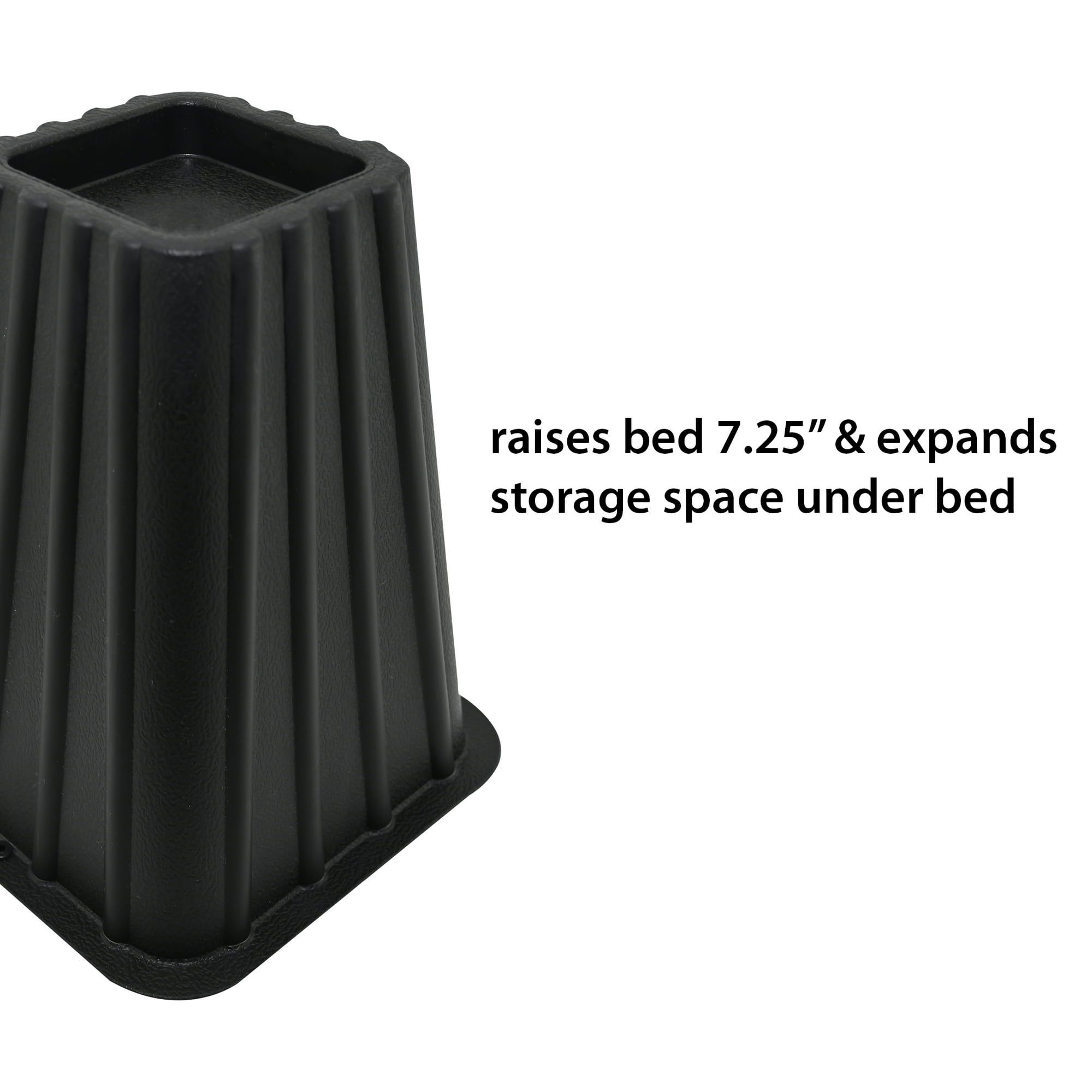 When you need some more storage space, or your bed just isn't tall enough for your liking, reach for these Home Management Tall Bed Risers in black to lift up your bed to instantly create more space. Each pack comes with four risers, perfect for a four-post bed. They're 7.25 inches tall and fits bedposts or casters up to 2.75 inches wide. These tall bed risers are made of a heavy-duty polypropylene plastic construction and can hold up to 300 pounds per riser. Simply slip a riser under each bedpost and instantly upgrade your bed by 7.25" inches, making it perfect for creating more under the bed space or just making it easier to get in and out of bed if you're tall.